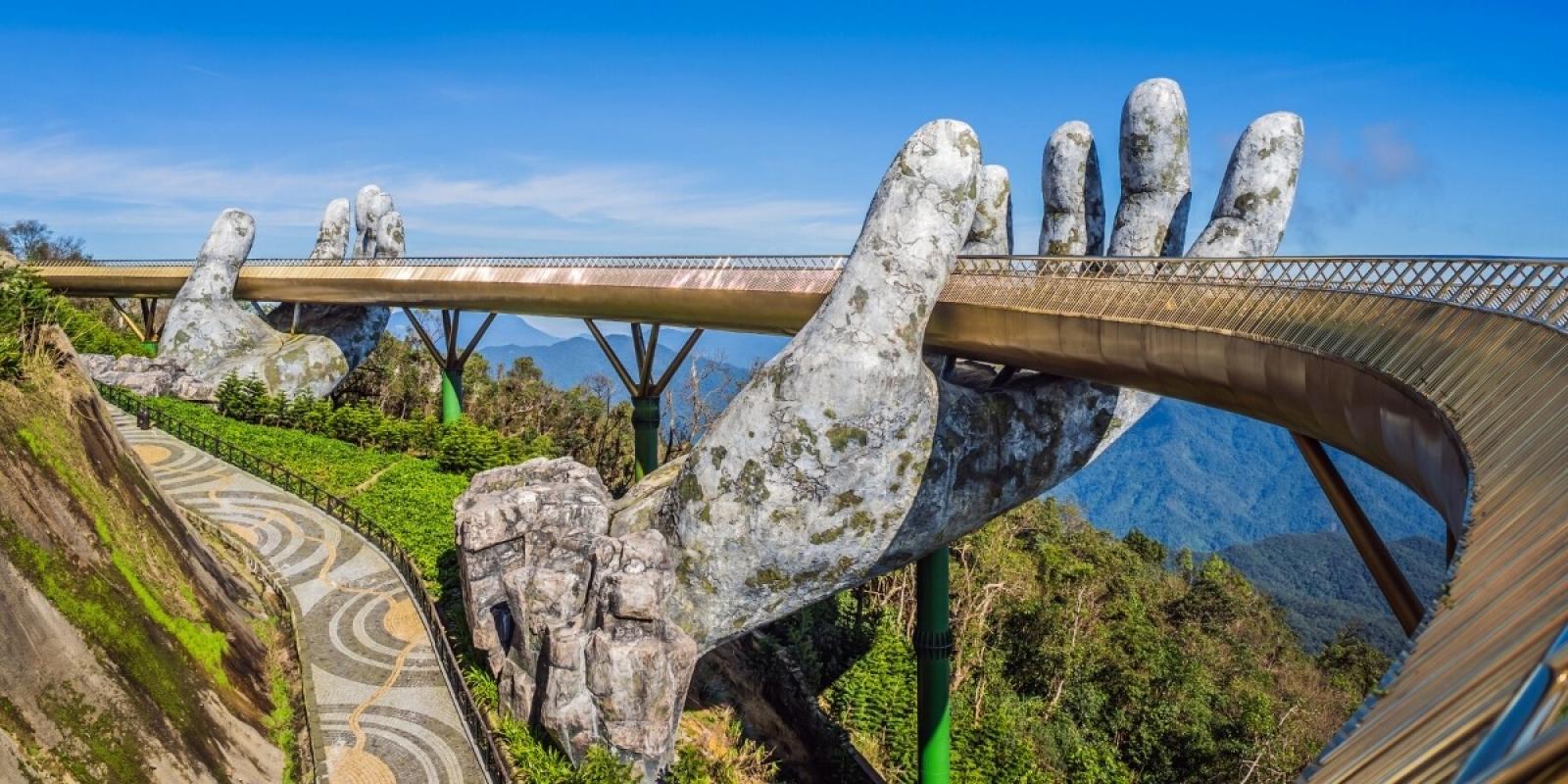 Незалежно від того, подорожуєте ви парою, соло чи сім'єю, обов'язково побувайте на Золотому мості. Він вважається символом Дананг. Зведено на висоті 1400 м над рівнем моря і має 150 м завдовжки. Звідси відкривається захоплююча панорама на околиці. Незвичайну архітектурну пам'ятку підтримують дві «руки велетня». Виготовлені вони, звичайно, з каменю! Але виглядають дуже реалістично.